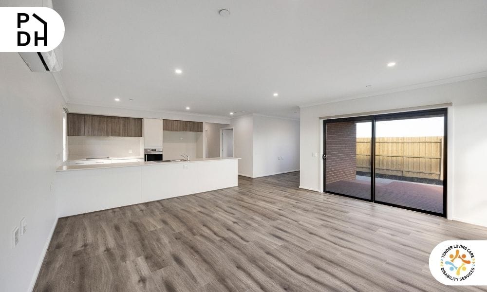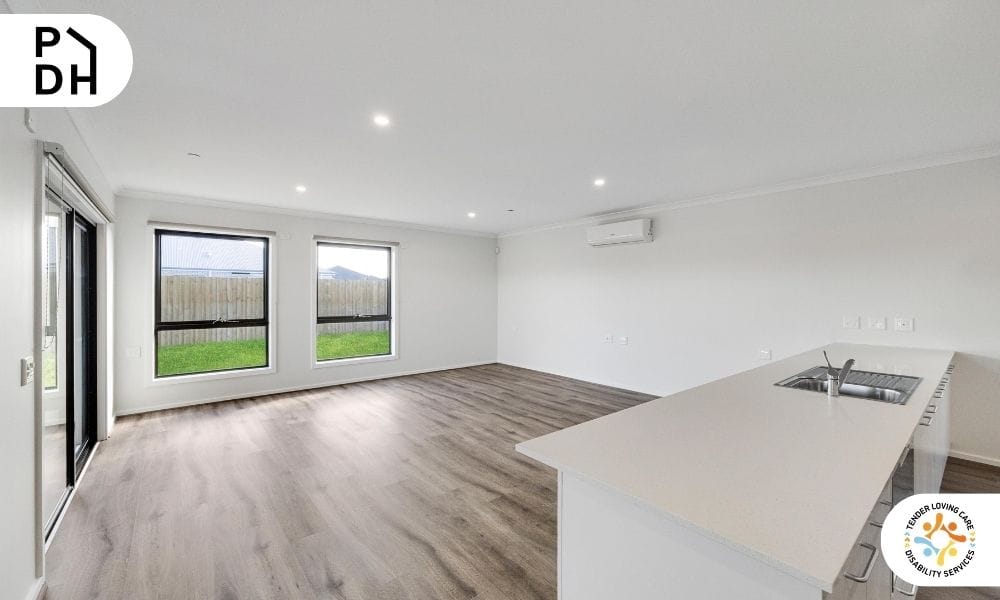 The home features private bedrooms with ensuite accessible bathrooms, open-plan living areas, and a layout designed to support safety, accessibility and everyday comfort. A dedicated On-Site Overnight Assistance (OOA) room is incorporated into the design, with flexibility for modifications if required.