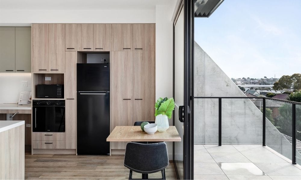 The apartments feature open-plan living and dining areas, accessible bathrooms, and private balconies (layout dependent). The development includes fire sprinklers, shared support arrangements onsite, and design features that support accessibility, durability, and everyday functionality within an apartment setting.